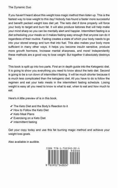 The Dynamic Duo If you haven't heard about this weight loss magic method then listen up. This is the fastest way to lose weight to this day! Nobody has found a faster more successful and benefit packed weight loss diet yet. The keto diet if done properly will force your body to target and burn fat. It will also produce ketones that will help make your mind sharp so you can be mentally alert and happier. Intermittent fasting is a diet scheduling your meals so it makes fasting easy enough that anyone can do it regardless of their routine. Fasting creates a state of which your body needs to go into your stored energy and turn that into fuel. This also makes your body more sufficient in many other ways. It helps you become insulin sensitive, produce more growth hormone, Increase mental sharpness, and more! Independently these methods are a good way to lose weight. But together it absolutely destroys fat.This book is split up into two parts. First an in depth guide into the Ketogenic diet. It is going to show you everything you need to know about the keto diet. Second is going to be a run down of intermittent fasting. It will be much shorter because it is much less complicated than the ketogenic diet. All you have to do is follow the regimen and eat your keto meals in the intermittent fasting schedule. Losing weight is easy all you need to know is what to eat, when to eat and how much to eat. Here's A little preview of is in this book. The Keto Diet and the Body's Reaction to it How to Follow the Keto Diet Keto Meal Plans Exercising on a Keto Diet Intermittent fasting Get your copy today and use this fat burning magic method and achieve your weight loss goals.Also available in audible.