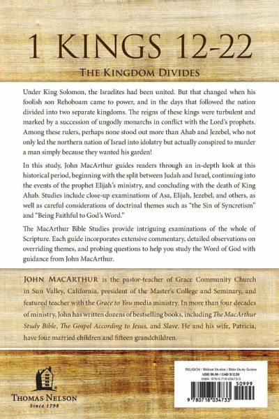 Under King Solomon the Israelites had been a united people, but that all changed when his foolish son Rehoboam came to power. In the days that followed, the nation divided into two separate kingdoms. The reigns of these kings were turbulent, marked by a succession of ungodly monarchs in conflict with the Lord's prophets. Among these rulers, perhaps none stood out more than Ahab and Jezebel, who not only led the northern nation of Israel into idolatry but actually conspired to murder a man simply because they wanted his garden! In this study, pastor John MacArthur will guide you through an in-depth look at this historical period, beginning with the split between Judah and Israel, continuing into the remarkable events that occurred during the prophet Elijah's ministry, and concluding with the death of the ungodly King Ahab. Studies include close-up examinations of Elijah, Ahab, Jezebel, Asa, and others, as well as careful considerations of doctrinal themes such as "the Sin of Syncretism" and "Being Faithful to God's Word." --ABOUT THE SERIES-- The MacArthur Bible Study series is designed to help you study the Word of God with guidance from widely respected pastor and author John MacArthur. Each guide provides intriguing examinations of the whole of Scripture by examining its parts and incorporates: Extensive, but straight-forward commentary on the text. Detailed observations on overriding themes, timelines, history, and context. Word and phrase studies to help you unlock the broader meaning and apply it to your life. Probing, interactive questions with plenty of space to write down your response and thoughts.