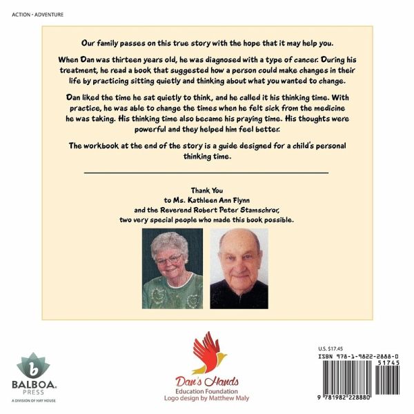 Our family passes on this true story with the hope that it may help you. When Dan was thirteen years old, he was diagnosed with a type of cancer. During his treatment, he read a book that suggested how a person could make changes in their life by practicing sitting quietly and thinking about what you wanted to change. Dan liked the time he sat quietly to think, and he called it his thinking time. With practice, he was able to change the times when he felt sick from the medicine he was taking. His thinking time also became his praying time. His thoughts were powerful, and they helped him feel better. The workbook at the end of the story is a guide designed for your child's personal thinking time.