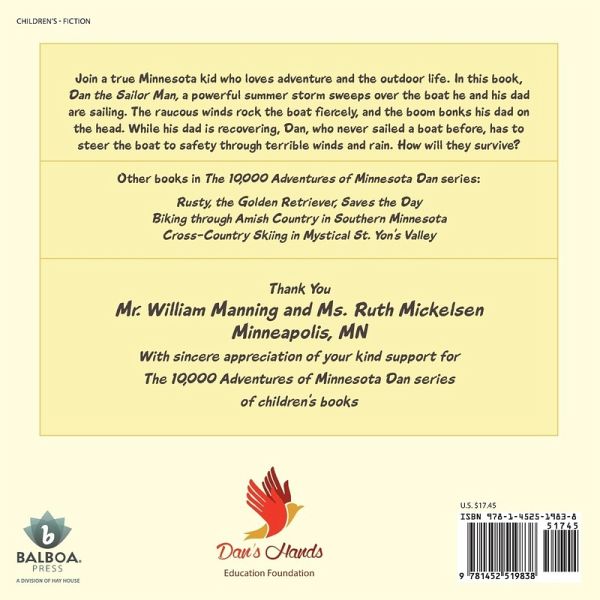 Join a true Minnesota kid who loves adventure and the outdoor life. In this book, Dan the Sailor Man, a powerful summer storm sweeps over the boat he and his dad are sailing. The raucous winds rock the boat fiercely, and the boom bonks his dad on the head. While his dad is recovering, Dan, who never sailed a boat before, has to steer the boat to safety through terrible winds and rain. How will they survive? Other books in The 10,000 Adventures of Minnesota Dan series: Rusty, the Golden Retriever, Saves the Day Biking through Amish Country in Southern Minnesota Cross-Country Skiing in Mystical St. Yon's Valley