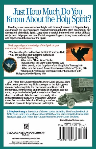 What do you want to know about the work of the Holy Spirit in this century? In 1,001 Things You Always Wanted to Know About the Holy Spirit, J. Stephen Lang provides information on people such as Dennis Bennett, Aimee Semple McPherson, C. Peter Wagner, and John Wimber as well as insight into movements such as the Azusa Street Revival, the growth of the Assemblies of God, the Full Gospel Business Men's Fellowship, the Keswick Convention, and the 1973 Notre Dame Conference. From Scripture songs to glossolalia, Charismatics to Pentecostals, this browse book is filled with important-and sometimes offbeat-information about what the Holy Spirit has (and has not) been doing in the twentieth century.