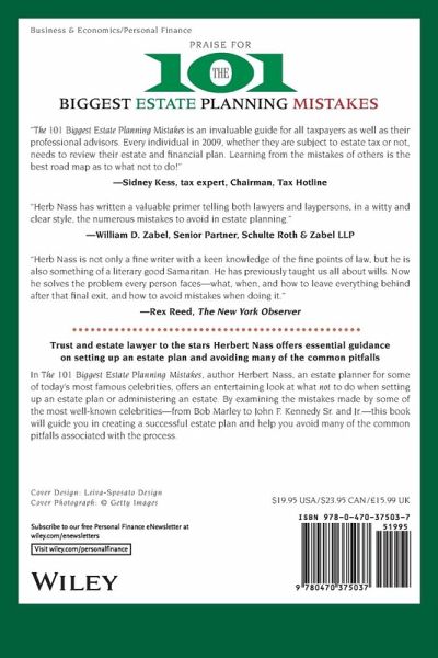 Business & Economics/Personal Finance PRAISE FOR THE 101 BIGGEST ESTATE P PLANNING MISTAKES "The 101 Biggest Estate Planning Mistakes is an invaluable guide for all taxpayers as well as their professional advisors. Every individual in 2009, whether they are subject to estate tax or not, needs to review their estate and financial plan. Learning from the mistakes of others is the best road map as to what not to do!" --Sidney Kess, tax expert, Chairman, Tax Hotline "Herb Nass has written a valuable primer telling both lawyers and laypersons, in a witty and clear style, the numerous mistakes to avoid in estate planning." --William D. Zabel, Senior Partner, Schulte Roth & Zabel LLP "Herb Nass is not only a fine writer with a keen knowledge of the fine points of law, but he is also something of a literary good Samaritan. He has previously taught us all about wills. Now he solves the problem every person faces--what, when, and how to leave everything behind after that final exit, and how to avoid mistakes when doing it." --Rex Reed, The New York Observer Trust and estate lawyer to the stars Herbert Nass offers essential guidance on setting up an estate plan and avoiding many of the common pitfalls In The 101 Biggest Estate Planning Mistakes, author Herbert Nass, an estate planner for some of today's most famous celebrities, offers an entertaining look at what not to do when setting up an estate plan or administering an estate. By examining the mistakes made by some of the most well-known celebrities--from Bob Marley to John F. Kennedy Sr. and Jr.--this book will guide you in creating a successful estate plan and help you avoid many of the common pitfalls associated with the process.