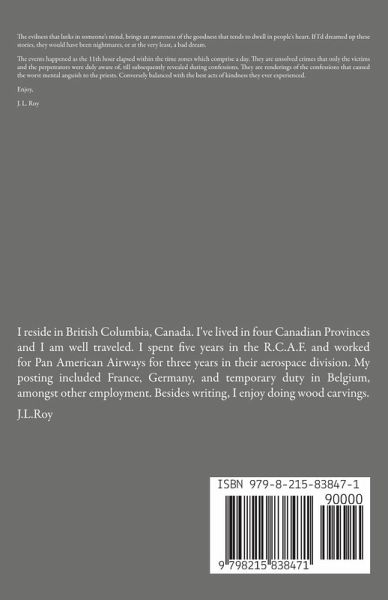 The evilness that lurks in someone's mind, brings an awareness of the goodness that tends to dwell in people's heart. If I'd dreamed up these stories, they would have been nightmares, or at the very least, a bad dream. The events happened as the 11th hour elapsed within the time zones which comprise a day. They are unsolved crimes that only the victims and the perpetrators were duly aware of, till subsequently revealed during confessions. They are renderings of the confessions that caused the worst mental anguish to the priests. Conversely balanced with the best acts of kindness they ever experienced. Enjoy, J. L. Roy