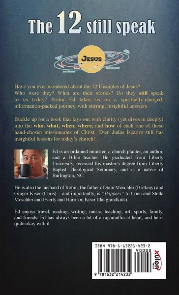 Have you ever wondered about the 12 Disciples of Jesus? Who were they? What are their stories? Do they still speak to us today? Pastor Ed takes us on a spiritually-charged, information-packed journey, with stirring, insightful answers. Buckle up for a book that lays out with clarity (yet dives in deeply) into the who, what, when, where, and how of each one of these hand-chosen missionaries of Christ. Even Judas Iscariot still has insightful lessons for today's church! Ed is an ordained minister, a church planter, an author, and a Bible teacher. He graduated from Liberty University, received his master's degree from Liberty Baptist Theological Seminary, and is a native of Burlington, NC. He is also the husband of Robin, the father of Sam Moschler (Brittany) and Ginger Kiser (Chris) - and importantly, is "Poppers" to Coen and Stella Moschler and Everly and Harrison Kiser (the grandkids). Ed enjoys travel, reading, writing, music, teaching, art, sports, family, and friends. Ed has always been a bit of a ragamullin at heart, and he is quite okay with it.