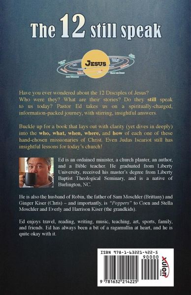 Have you ever wondered about the 12 Disciples of Jesus? Who were they? What are their stories? Do they still speak to us today? Pastor Ed takes us on a spiritually-charged, information-packed journey, with stirring, insightful answers. Buckle up for a book that lays out with clarity (yet dives in deeply) into the who, what, when, where, and how of each one of these hand-chosen missionaries of Christ. Even Judas Iscariot still has insightful lessons for today's church! Ed is an ordained minister, a church planter, an author, and a Bible teacher. He graduated from Liberty University, received his master's degree from Liberty Baptist Theological Seminary, and is a native of Burlington, NC. He is also the husband of Robin, the father of Sam Moschler (Brittany) and Ginger Kiser (Chris) - and importantly, is "Poppers" to Coen and Stella Moschler and Everly and Harrison Kiser (the grandkids). Ed enjoys travel, reading, writing, music, teaching, art, sports, family, and friends. Ed has always been a bit of a ragamullin at heart, and he is quite okay with it.