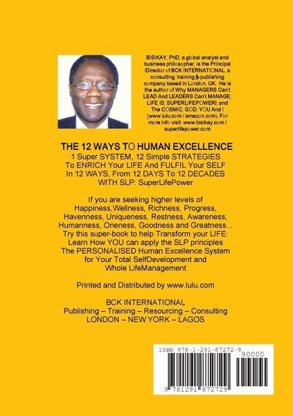 If you are seeking higher levels of Happiness,Wellness, Richness, Progress, Havenness, Uniqueness, Restness, Awareness, Humanness, Oneness, Goodness and Greatness... Try this super-book to help You TRANSFORM your LIFE and RENEW your SELF totally with a simple practical system. The 12 WAYS To HUMAN EXCELLENCE is unlike any other personal development book, as such. This seminal book/manual contains some new and very unique concepts and principles about Human Life. And, it also presents perhaps the most powerful system ever conceived for self improvement and life management in a PERSONALISED format to meet anyone and everyone's individual needs for the elusive Life Enrichment and Self Fulfilment. We give you the new model called SLP, SuperLifePower for your Strategic Life Planning: 1 Super SYSTEM, 12 Simple STRATEGIES To ENRICH Your LIFE And FULFIL Your SELF In 12 WAYS, From 12 DAYS To 12 DECADES Why not let this exceptional book lead you to understanding and achieving your own Human Excellence...