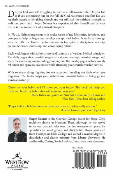 Do you find yourself struggling to survive a rollercoaster life? Do you feel as if you are missing out on the full life God has created you for? Do you regularly attend a life giving church and yet still lack the spiritual strength to walk out your faith. Roger Nelmes has experienced this himself and believes that it is due to our lack of spiritual discipline. In The 12, Nelmes inspires us with twelve weeks of real life stories, devotions, and prompts to help us begin and develop our spiritual habits. It walks us through what he calls The Twelve: twelve minutes in five spiritual disciplines: worship, prayer, devotion, journaling, and encouraging others. Each week begins with a short story and summary of various Biblical principles. The daily pages then provide suggested scripture readings, worship songs, and space for journaling and recording your prayers. The Sunday pages include weekly reflection and space to take notes while attending your church worship service. With so many things fighting for our attention, building our faith often gets forgotten. The Twelve helps you establish five essential habits to bring greater spiritual maturity. "Show me your habits and I'll show you your future! This book will help you make and break the habits that will make or break you." -Mark Batterson, pastor of National Community Church and New York Times best selling author "Roger builds a bold response to draw hearts back to what really matters." -Daniel Groves, pastor of Hope City