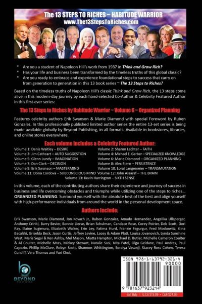 Are you a student of Napoleon Hill's classic from 1937 Think and Grow Rich? Has your life or business benefited from the timeless truths of this global classic? Experience these foundational principles of success that carry on from generation to generation. Presenting: The 13 Steps to Riches by Habitude Warrior Special Edition Volume 6 ORGANIZED PLANNING. Based on the timeless truths of Napoleon Hill's classic Think and Grow Rich, the 13 steps come alive in this modern-day journey by each hand-selected author in this first-ever series. The 13 Steps to Riches by Habitude Warrior Special Edition Volume 6 ORGANIZED PLANNING features celebrity authors Erik Swanson and Marie Diamond with a special Foreword by Olympian Ruben Gonzalez. In this professionally published limited author series the entire 13-set series is being made available globally by Beyond Publishing, in all formats. Available in bookstores, libraries, and online stores everywhere. Each volume features a Celebrity Author: Volume 1: Denis Waitley - DESIRE Volume 2: Sharon Lechter - FAITH Volume 3: Jim Cathcart - AUTO SUGGESTION Volume 4: Michael E. Gerber - SPECIALIZED KNOWLEDGE Volume 5: Glenn Lundy - IMAGINATION Volume 6: Marie Diamond - ORGANIZED PLANNING Volume 7: Dan Clark - DECISION Volume 8: Alec Stern - PERSISTENCE Volume 9: Erik Swanson - MASTERMIND Volume 10: Loral Langemeier - TRANSMUTATION Volume 11: Doria Cordova - SUBCONSCIOUS MIND Volume 12: John Assaraf - THE BRAIN Volume 13: Kevin Harrington - SIXTH SENSE In this sixth volume, each of the contributing authors share their experience and journey of success in business and life overcoming obstacles and triumphs while utilizing one of the steps to riches... ORGANIZED PLANNING. Surround yourself with the absolute best of the best and align yourself with high-performance individuals from around the world in the personal development space. Authors include: Erik Swanson, Marie Diamond, Ruben Gonzalez, Jon Kovach Jr., Amado Hernandez, Angelika Ullsperger, Anthony Criniti, Barry Bevier, Bonnie Lierse, Brian Schulman, Candace & David Rose, Corey Poirier, Deb Scott, Dori Ray, Elaine Sugimura, Elizabeth Walker, Erin Ley, Fatima Hurd, Frankie Fegurgur, Fred Moskowitz, Freeman Witherspoon, Gina Bacalski, Griselda Beck, Jason Curtis, Jeffrey Levine, Lacey & Adam Platt, Louisa Jovanovich, Lynda Sunshine West, Maris Segal & Ken Ashby, Mel Mason, Miatta Hampton, Michael D. Butler, Michelle Cameron Coulter & Al Coulter, Michelle Mras, Mickey Stewart, Natalie Susi, Nita Patel, Olga Geidane, Paul Capozio, Paul Andres, Phillip McClure, Robyn Scott, Shannon Whittington, Soraiya Vasanji, Stacey Ross Cohen, Teresa Cundiff, Vera Thomas and Yuri Choi. Habitude Warrior The 13 Steps to Riches, Special Edition Volume 6 ORGANIZED PLANNING releasing May 15, 2022 available for pre-order now. Grab all 13 to complete your library!