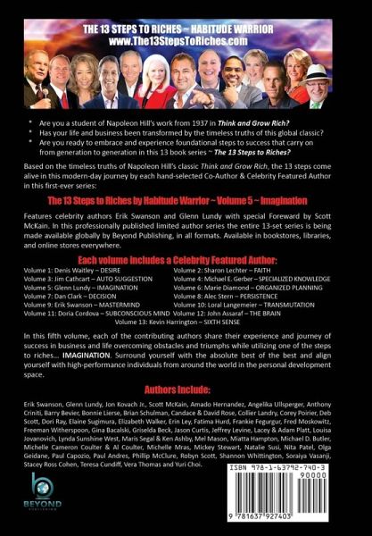- Are you a student of Napoleon Hill's classic from 1937 Think and Grow Rich? - Has your life or business benefited from the timeless truths of this global classic? - Experience these foundational principles of success that carry on from generation to generation. Presenting: The 13 Steps to Riches by Habitude Warrior Special Edition Volume 5 Imagination Based on the timeless truths of Napoleon Hill's classic Think and Grow Rich, the 13 steps come alive in this modern-day journey by each hand-selected author in this first-ever series. The 13 Steps to Riches by Habitude Warrior Special Edition Volume 5 Imagination features celebrity authors Erik Swanson and Glenn Lundy with special Foreward by Scott McKain. In this professionally published limited author series the entire 13-set series is being made available globally by Beyond Publishing, in all formats. Available in bookstores, libraries, and online stores everywhere. Each volume features a Celebrity Author: Volume 1: Denis Waitley - DESIRE Volume 2: Sharon Lechter - FAITH Volume 3: Jim Cathcart - AUTO SUGGESTION Volume 4: Michael E. Gerber - SPECIALIZED KNOWLEDGE Volume 5: Glenn Lundy - IMAGINATION Volume 6: Marie Diamond - ORGANIZED PLANNING Volume 7: Dan Clark - DECISION Volume 8: Alec Stern - PERSISTENCE Volume 9: Erik Swanson - MASTERMIND Volume 10: Loral Langemeier - TRANSMUTATION Volume 11: Doria Cordova - SUBCONSCIOUS MIND Volume 12: John Assaraf - THE BRAIN Volume 13: Kevin Harrington - SIXTH SENSE In this fifth volume, each of the contributing authors share their experience and journey of success in business and life overcoming obstacles and triumphs while utilizing one of the steps to riches... IMAGINATION. Surround yourself with the absolute best of the best and align yourself with high-performance individuals from around the world in the personal development space. Authors include: Erik Swanson, Glenn Lundy, Jon Kovach Jr., Scott McKain, Amado Hernandez, Angelika Ullsperger, Anthony Criniti, Barry Bevier, Bonnie Lierse, Brian Schulman, Candace & David Rose, Collier Landry, Corey Poirier, Deb Scott, Dori Ray, Elaine Sugimura, Elizabeth Walker, Erin Ley, Fatima Hurd, Frankie Fegurgur, Fred Moskowitz, Freeman Witherspoon, Gina Bacalski, Griselda Beck, Jason Curtis, Jeffrey Levine, Lacey & Adam Platt, Louisa Jovanovich, Lynda Sunshine West, Maris Segal & Ken Ashby, Mel Mason, Miatta Hampton, Michael D. Butler, Michelle Cameron Coulter & Al Coulter, Michelle Mras, Mickey Stewart, Natalie Susi, Nita Patel, Olga Geidane, Paul Capozio, Paul Andres, Phillip McClure, Robyn Scott, Shannon Whittington, Soraiya Vasanji, Stacey Ross Cohen, Teresa Cundiff, Vera Thomas and Yuri Choi. Habitude Warrior The 13 Steps to Riches, Special Edition Volume 5 Imagination releasing March 15, 2022 available for pre-order now. Grab all 13 to complete your library!