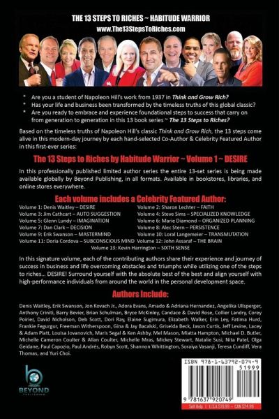Are you a student of Napoleon Hill's classic from 1937 Think and Grow Rich? Has your life or business benefited from the timeless truths of this global classic? Experience these foundational principles of success that carry on from generation to generation. Presenting: The 13 Steps to Riches by Habitude Warrior Volume 1 DESIRE Based on the timeless truths of Napoleon Hill's classic Think and Grow Rich, the 13 steps come alive in this modern-day journey by each hand-selected author in this first-ever series: The 13 Steps to Riches by Habitude Warrior Special Edition Volume 1 DESIRE In this professionally published limited author series the entire 13-set series is being made available globally by Beyond Publishing, in all formats. Available in bookstores, libraries, and online stores everywhere. Each volume features a Celebrity Author: Volume 1: Denis Waitley - DESIRE Volume 2: Sharon Lechter - FAITH Volume 3: Jim Cathcart - AUTO SUGGESTION Volume 4: Steve Sims - SPECIALIZED KNOWLEDGE Volume 5: Glenn Lundy - IMAGINATION Volume 6: Marie Diamond - ORGANIZED PLANNING Volume 7: Dan Clark - DECISION Volume 8: Alec Stern - PERSISTENCE Volume 9: Erik Swanson - MASTERMIND Volume 10: Loral Langemeier - TRANSMUTATION Volume 11: Doria Cordova - SUBCONSCIOUS MIND Volume 12: John Assaraf - THE BRAIN Volume 13: Kevin Harrington - SIXTH SENSE Authors include: Denis Waitley, Erik Swanson, Jon Kovach Jr., Michael D. Butler, Adora Evans, Amado & Adriana Hernandez, Angelika Ullsperger, Anthony Criniti, Barry Bevier, Brian Schulman, Bryce McKinley, Candace & David Rose, Collier Landry, Corey Poirier, David Nicholson, Deb Scott, Dori Ray, Elaine Sugimura, Elizabeth Walker, Erin Ley, Fatima Hurd, Frankie Fegurgur, Freeman Witherspoon, Gina & Jay Bacalski, Griselda Beck, Jason Curtis, Jeff Levine, Lacey & Adam Platt, Louisa Jovanovich, Maris Segal & Ken Ashby, Mel Mason, Miatta Hampton, Michelle Cameron Coulter & Allan Coulter, Michelle Mras, Mickey Stewart, Natalie Susi, Nita Patel, Olga Geidane, Paul Capozio, Paul Andrés, Robyn Scott, Shannon Whittington, Soraiya Vasanji, Teresa Cundiff, Vera Thomas, and Yuri Choi. Habitude Warrior 13 Steps to Riches, Volume 1 Desire releasing July 15, 2021 available for pre-order now. Grab all 13 to complete your library!