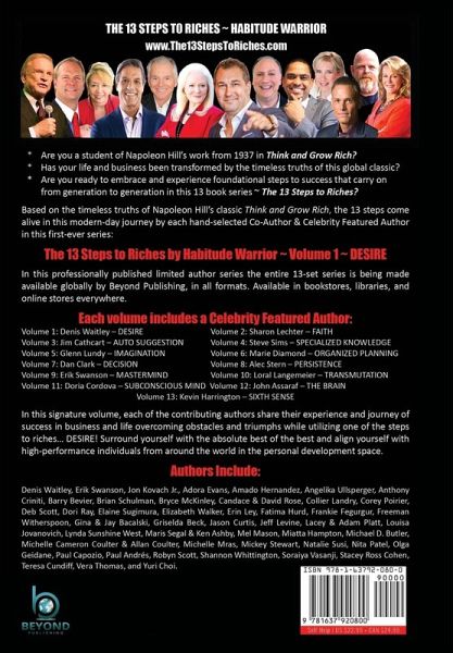 * Are you a student of Napoleon Hill's classic from 1937 Think and Grow Rich? * Has your life or business benefited from the timeless truths of this global classic? * Experience these foundational principles of success that carry on from generation to generation. Presenting: The 13 Steps to Riches by Habitude Warrior Volume 1 DESIRE Based on the timeless truths of Napoleon Hill's classic Think and Grow Rich, the 13 steps come alive in this modern-day journey by each hand-selected author in this first-ever series: The 13 Steps to Riches by Habitude Warrior Special Edition Volume 1 DESIRE In this professionally published limited author series the entire 13-set series is being made available globally by Beyond Publishing, in all formats. Available in bookstores, libraries, and online stores everywhere. Each volume features a Celebrity Author: Volume 1: Denis Waitley - DESIRE Volume 2: Sharon Lechter - FAITH Volume 3: Jim Cathcart - AUTO SUGGESTION Volume 4: Steve Sims - SPECIALIZED KNOWLEDGE Volume 5: Glenn Lundy - IMAGINATION Volume 6: Marie Diamond - ORGANIZED PLANNING Volume 7: Dan Clark - DECISION Volume 8: Alec Stern - PERSISTENCE Volume 9: Erik Swanson - MASTERMIND Volume 10: Loral Langemeier - TRANSMUTATION Volume 11: Doria Cordova - SUBCONSCIOUS MIND Volume 12: John Assaraf - THE BRAIN Volume 13: Kevin Harrington - SIXTH SENSE Authors include: Denis Waitley, Erik Swanson, Jon Kovach Jr., Michael D. Butler, Adora Evans, Amado & Adriana Hernandez, Angelika Ullsperger, Anthony Criniti, Barry Bevier, Brian Schulman, Bryce McKinley, Candace & David Rose, Collier Landry, Corey Poirier, David Nicholson, Deb Scott, Dori Ray, Elaine Sugimura, Elizabeth Walker, Erin Ley, Fatima Hurd, Frankie Fegurgur, Freeman Witherspoon, Gina & Jay Bacalski, Griselda Beck, Jason Curtis, Jeff Levine, Lacey & Adam Platt, Louisa Jovanovich, Maris Segal & Ken Ashby, Mel Mason, Miatta Hampton, Michelle Cameron Coulter & Allan Coulter, Michelle Mras, Mickey Stewart, Natalie Susi, Nita Patel, Olga Geidane, Paul Capozio, Paul Andrés, Robyn Scott, Shannon Whittington, Soraiya Vasanji, Teresa Cundiff, Vera Thomas, and Yuri Choi. Habitude Warrior 13 Steps to Riches, Volume 1 Desire releasing July 15, 2021 available for pre-order now. Grab all 13 to complete your library!