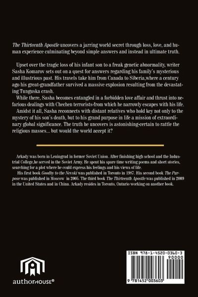 The Thirteenth Apostle uncovers a jarring world secret through loss, love, and human experience culminating beyond simple answers and instead in ultimate truth. Upset over the tragic loss of his infant son to a freak genetic abnormality writer Sasha Komarov, sets out on a quest for answers regarding his family's mysterious and illustrious past. His travels take him from Canada to Siberia,where a century ago his great-grandfather survived a massive explosion resulting from the devastating Tunguska crash. While there, Sasha becomes entangled in a forbidden love affair and thrust into nefarious dealings with Chechen terrorists-from which he narrowly escapes with his life. Amidst it all, Sasha reconnects with distant relatives who hold key not only to the mystery of his son's death, but to his grand purpose in life a mission of extraordinary global significance. The truth he uncovers is astonishing-certain to rattle the religious masses...but would the world accept it?