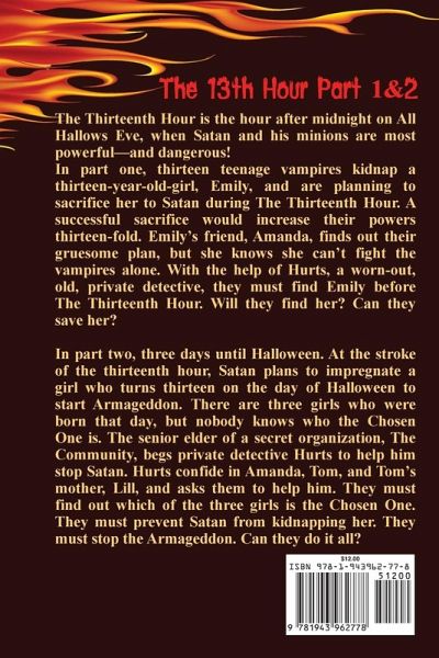 The Thirteenth Hour is the hour after midnight on All Hallows Eve when Satan and his minions are most powerful-and dangerous! In part one, thirteen teenage vampires kidnap a thirteen-year-old-girl, Emily, and are planning to sacrifice her to Satan during The Thirteenth Hour. A successful sacrifice would increase their powers thirteen-fold. Emily's friend, Amanda, finds out their gruesome plan, but she knows she can't fight the vampires alone. With the help of Hurts, a worn-out, old, private detective, they must find Emily before The Thirteenth Hour. Will they find her? Can they save her? In part two, three days until Halloween. At the stroke of the thirteenth hour, Satan plans to impregnate a girl who turns thirteen on the day of Halloween to start Armageddon. There are three girls who were born that day, but nobody knows who the Chosen One is. The senior elder of a secret organization, The Community, begs private detective Hurts to help him stop Satan. Hurts confide in Amanda, Tom, and Tom's mother, Lill, and asks them to help him. They must find out which of the three girls is the Chosen One. They must prevent Satan from kidnapping her. They must stop the Armageddon. Can they do it all?