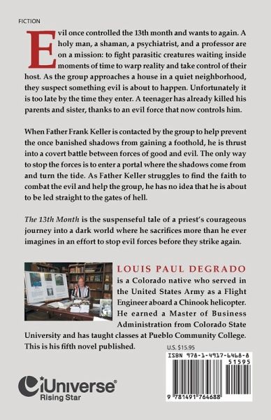 Evil once controlled the 13th month and wants to again. A holy man, a shaman, a psychiatrist, and a professor are on a mission: to fight parasitic creatures waiting inside moments of time to warp reality and take control of their host. As the group approaches a house in a quiet neighborhood, they suspect something evil is about to happen. Unfortunately it is too late by the time they enter. A teenager has already killed his parents and sister, thanks to an evil force that now controls him. When Father Frank Keller is contacted by the group to help prevent the once banished shadows from gaining a foothold, he is thrust into a covert battle between forces of good and evil. The only way to stop the forces is to enter a portal where the shadows come from and turn the tide. As Father Keller struggles to find the faith to combat the evil and help the group, he has no idea that he is about to be led straight to the gates of hell. The 13th Month is the suspenseful tale of a priest's courageous journey into a dark world where he sacrifices more than he ever imagines in an effort to stop evil forces before they strike again.