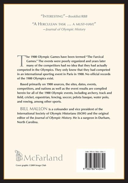 The 1900 Olympic Games have been termed "The Farcical Games." The events were poorly organized and years later many of the competitors had no idea that they had actually competed in the Olympics. They only knew that they had competed in an international sporting event in Paris in 1900. No official records of the 1900 Olympics exist. Based primarily on 1900 sources, the sites, dates, events, competitors, and nations as well as the event results are compiled herein for all of the 1900 Olympic events, including archery, track and field, cricket, equestrian, fencing, soccer, pelota basque, water polo, and rowing, among other sports.…mehr