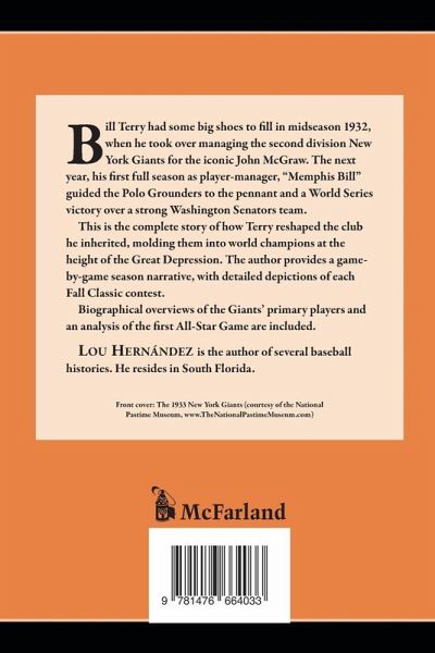 Bill Terry had some big shoes to fill in midseason 1932, when he took over managing the second division New York Giants for the iconic John McGraw. The next year, his first full season as player-manager, ""Memphis Bill"" guided the Polo Grounders to the pennant and a World Series victory over a strong Washington Senators team. This is the complete story of how Terry reshaped the club he inherited, molding them into world champions at the height of the Great Depression. The author provides a game-by-game season narrative, with detailed depictions of each Fall Classic contest. Biographical overviews of the Giants' primary players and an analysis of the first All-Star Game are included.
