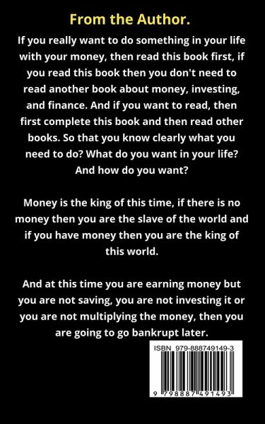 If you really want to do something in your life with your money, then read this book first, if you read this book then you don't need to read another book about money, investing, and finance. And if you want to read, then first complete this book and then read other books. So that you know clearly what you need to do? What do you want in your life? And how do you want? Money is the king of this time, if there is no money then you are the slave of the world and if you have money then you are the king of this world. And at this time you are earning money but you are not saving, you are not investing it or you are not multiplying the money, then you are going to go bankrupt later. This book is for all those people who want to save money, invest money or want to multiply their money. This book is a must-read by everyone once in life, it is a small book according to new age, but don't compare the knowledge of this book it is the full bible of investing.