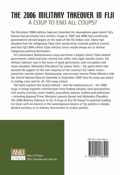 This book explores the factors behind the 2006 coup in Fiji. It brings together contributions from leading scholars, local personalities, civil society activists, union leaders, journalists, lawyers, soldiers and politicians.