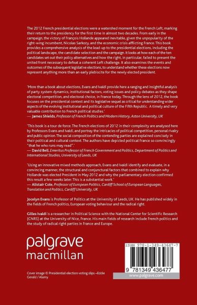 "More than a book about elections, Evans and Ivaldi provide here a ranging and insightful analysis of party system dynamics, institutional factors, voting issues and policy debates as they shape electoral competition, and electoral choice, in France today. Through the lens of 2012, the book focuses on the presidential contest and its legislative sequel as critical for understanding wider aspects of the evolving institutional and political culture of the Fifth Republic. A timely and very valuable contribution to French political studies."