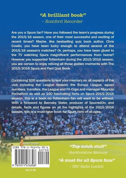Are you a Spurs fan? Have you followed the team’s progress during the 2015/16 season, one of their most successful and exciting of recent times? Maybe, like bestselling quiz book author, Chris Cowlin, you have been lucky enough to attend several of the 2015/16 season’s matches? Or, perhaps, you have been glued to the TV watching Spurs magnificent performances from home? However you supported Tottenham during the 2015/2016 season, you are certain to enjoy reliving all those golden moments with The 2015/2016 Spurs and Fact Quiz Book. Containing 100 questions to test your memory on all aspects of the club including the League Season, the Europa League, squad numbers, transfers, the League and FA Cups and manager Mauricio Pochettino as well as 100 fascinating facts on Spurs 2015/2016 season, this is a book no Tottenham fan will want to be without. With a foreword by Barnaby Slater, producer of SpurredOn, and details, facts and figures on all the highlights of the 2015/2016 season, this is a must-have book for Spurs fans of all ages.