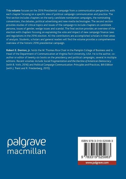 Preface by Robert E. Denton, Jr.- Part I Political Campaign Communication in 2016 Presidential Campaign.- Chapter 1 The Early Campaign of 2016: And They Just Kept Coming by Judith Trent.- Chapter 2 The Nomination Game: 2016 by Henry C. Kenski and Kate M. Kenski.- Chapter 3 The 2016 Presidential Nominating Conventions by Rachel L. Holloway.- Chapter 4 Presidential Debates 2012 by Ben Voth.- Chapter 5 Political Advertising in the 2012 U.S. Presidential Election by John Tedesco and Scott Dunn.- Chapter 6 The New Media Campaign of 2016 by John Allen Hendricks, Stephen F. Austin State University and Dan Schill.- Part II Studies of Communication in the 2016 Presidential Campaign.- Chapter 7 'Personae' in the 2016 Republican Nomination Campaign by Dennis D. Cali.- Chapter 8 A Gendered Influence in Campaign Debates? Exploring Hillary Rodham Clinton's Presidential Debate Performance by Mitchel S. McKinney and Mary C. Banwart.- Chapter 9 Issues of Gender in the 2016 Presidential Campaign by Robert E. Denton.- Chapter 10 The Politics of Hate: The Creation and Response to Wedge Issues by Rita Kirk and Stephanie Ann Martin.- Chapter 11 Political Scandals in the 2016 Presidential Campaign by David R. Dewberry.- Part III The 2016 Presidential Election.- Chapter 12 Campaign Finance and its Impact in the 2016 Presidential Campaign by Cacey Myers.- Chapter 13 Explaining the Vote in 2012 by Henry C. Kenski and Kate M. Kenski