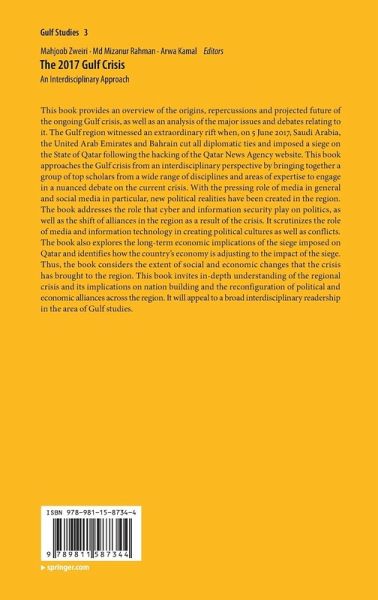 Chapter 1.Introduction.- Chapter 2.Evolving threat perceptions and changing regional dynamics in a 'post-GCC' era.- Chapter 3 .Qatar: Small State, Wise Power: A Contextual Perspective.- Chapter 4. Malaysia-Qatar Relationship: Perspective from Malaysia "An Emerging Middle Power".- Chapter 5.Hack-and-leak operations around the Gulf crisis.- Chapter 6.Trans-Gulf Resonances: Egypt's influence in Saudi Arabia Vision 2030.- Chapter 7.Qatar-Turkey Reapproachement: Challenging the Regional Status Quo in The Middle East.- Chapter 8.Qatar Crisis: GCC States' Perception of Regional Powers.- Chapter 9.The Qatar-Iran-Turkey Nexus: Shifts in Political Alliances and Economic Diversifications in the Gulf Crisis.- Chapter 10.Look Middle, Look East! The Future of GCC Strategic Partnerships.- Chapter 11.Tweeting the Gulf Crisis 2017: Social media and its role inthe production and nutrition of crises.- Chapter 12.Iran's Response to Regional Crises: The Case of the Blockade Against Qatar.- Chapter 13.The sovereign wealth fund, security and foreign policy and Qatar blockade.- Chapter 14.The Qatar Blockade: the viewpoint of Qatari youth.- Chapter 15.Gulf Crisis in the Academia of Pakistan.- Chapter 16.Popular Sentiments and Elite Threat Perception in the Gulf: Iran in the Public Discourse in Saudi Arabia.- Chapter 17.The Gulf Crisis: the development of Qatari Macroeconomic Model.-