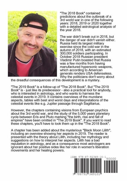 "The 2019 Book" contains an analysis of the astrological influences in 2019. In this way it is a practical tool for anybody, who is interested in astrology. It is furthermore a follow-up of "The 2018 Book", which explored the possibility of an imminent world war. The war didn't break out in 2018, but the danger of war didn't vanish either. Russia held its largest military exercise since the cold war in the autumn of 2018, with an estimated 300,000 soldiers participating. In October 2018 Russian president Vladimir Putin boasted that Russia was a few months from having manufactured hypersonic weapons, which according to American generals renders USA defenseless. "The 2019 Book" contains overviews of the mundane aspects, tables with best and worst days and interpretations of the celestial events like e.g. Jupiter passage through Sagittarius. A chapter has been added about the mysterious "Black Moon Lilith", including an overview showing her aspects in 2019.