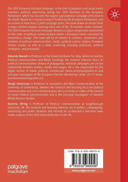 The 2019 European Electoral Campaign: In the Time of Populism and Social Media examines political advertising during the 2019 elections to the European Parliament, which has become the largest supranational campaign of its kind in the world. Based on a research project funded by the European Parliament, and an archive of more than 11,000 campaign items, the book draws on results from a major content analysis covering every one of the 28 member states involved. The 2019 European Electoral Campaign delivers a unique comparative assessment on the state of political communication within a European Union convulsed by momentous change. This book will be of interest to scholars, researchers and students of political communication, media, political science, history, European (Union) studies as well as a wider readership including politicians, political strategists, and journalists.