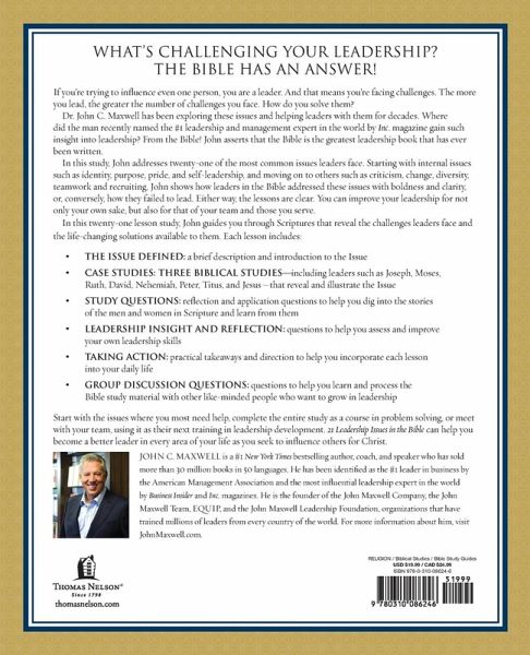 What's challenging your leadership? The Bible has an answer! If you're trying to influence even one person, you are a leader. And that means you're facing challenges. The more you lead, the greater the number of challenges you face. How do you solve them? Dr. John C. Maxwell has been exploring these issues and helping leaders with them for decades. Where did Maxwell, recently named the #1 leadership and management expert in the world by Inc. magazine, gain such insight into leadership? From the Bible! John asserts that the Bible is the greatest leadership book that has ever been written. In this study, John addresses twenty-one of the most common issues leaders face. Starting with internal issues such as identity, purpose, pride, and self-leadership, and moving on to others such as criticism, change, diversity, teamwork and recruiting, John shows how leaders in the Bible addressed these issues with boldness and clarity, or, conversely, how they failed to lead. Either way, the lessons are clear. You can improve your leadership for not only your own sake, but also for that of your team and those you serve. In this twenty-one lesson study, John guides you through Scriptures that reveal the challenges leaders face and the solutions available to them. Each lesson includes: THE ISSUE DEFINED: a brief description and introduction to the Issue CASE STUDIES: THREE BIBLICAL STUDIES: including leaders such as Joseph, Moses, Ruth, David, Nehemiah, Peter, Titus, and Jesus--that reveal and illustrate the Issue STUDY QUESTIONS: reflection and application questions to help you dig into the stories of the men and women in Scripture and learn from them LEADERSHIP INSIGHT AND REFLECTION: questions to help you assess and improve your own leadership skills TAKING ACTION: practical takeaways and direction to help you incorporate each lesson into your daily life GROUP DISCUSSION QUESTIONS: questions to help you learn and process the Bible study material with other like-minded people who want to grow in leadership Start with the issues where you most need help, complete the entire study as a course in problem solving, or meet with your team, using it as their next training in leadership development. 21 Leadership Issues in the Bible can help you become a better leader in any area of your life as you seek to influence others for Christ.