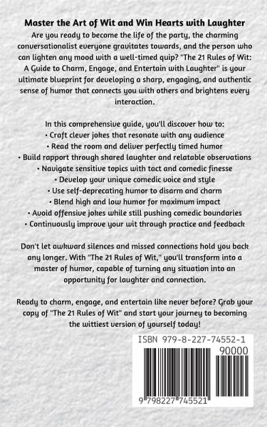 Master the Art of Wit and Win Hearts with Laughter Are you ready to become the life of the party, the charming conversationalist everyone gravitates towards, and the person who can lighten any mood with a well-timed quip? "The 21 Rules of Wit: A Guide to Charm, Engage, and Entertain with Laughter" is your ultimate blueprint for developing a sharp, engaging, and authentic sense of humor that connects you with others and brightens every interaction. In this comprehensive guide, you'll discover how to: Craft clever jokes that resonate with any audience Read the room and deliver perfectly timed humor Build rapport through shared laughter and relatable observations Navigate sensitive topics with tact and comedic finesse Develop your unique comedic voice and style Use self-deprecating humor to disarm and charm Blend high and low humor for maximum impact Avoid offensive jokes while still pushing comedic boundaries Continuously improve your wit through practice and feedback Don't let awkward silences and missed connections hold you back any longer. With "The 21 Rules of Wit," you'll transform into a master of humor, capable of turning any situation into an opportunity for laughter and connection. Ready to charm, engage, and entertain like never before? Grab your copy of "The 21 Rules of Wit" and start your journey to becoming the wittiest version of yourself today!