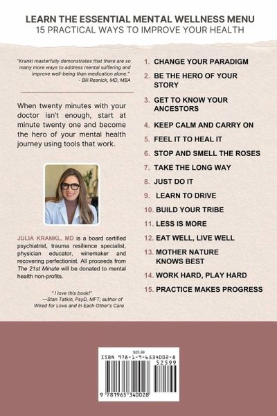 One in six American adults take psychiatric medication and yet, doctors are only allotted twenty-minute appointments that are spaced out by months at a time. This book starts at minute twenty-one and is filled with everything you wish your doctor had time to explain about mental health. Nearly sixty million American adults struggle with mental illness but half are not receiving any treatment and only a quarter of them have access to psychotherapy. With demand for treatment far outpacing supply, our current mental health crisis requires a new approach that goes beyond the limitations of the health care system. Dr. Julia Krankl, a Harvard and UCLA-trained psychiatrist, trauma resilience specialist and physician educator details her mental wellness menu-fifteen practical ways to improve mental health that don't involve taking a pill or doing formal therapy. Readers of The 21st Minute will be empowered to become the hero of their mental wellness journey using tools that work. The 21st Minute bridges the gap between what doctors hurriedly explain in twenty minutes and what we all need to thrive. For physicians and therapists who practice holistic mental health care, The 21st Minute stands as an evidence-based resource of alternatives and adjuncts to medication management and psychotherapy. The 21st Minute offers an accessible and transformative roadmap to optimal mental wellness using modern medicine, evolutionary psychology and diverse cultural perspectives. If you are ready for a new approach to achieve your mental health goals on your terms-this is it.