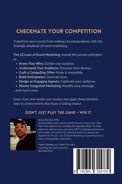 Checkmate Your Competition! In the high-stakes world of event marketing, every move counts. Dondrae Mills, Denver's renowned event maestro, shares his winning playbook in The 22 Laws of Event Marketing. Uncover the strategic secrets to create unforgettable experiences, from knowing your "why" and understanding your audience to crafting irresistible value propositions and leveraging technology. This isn't just a book-it's your roadmap to event marketing mastery. Transform your events into a legendary experience