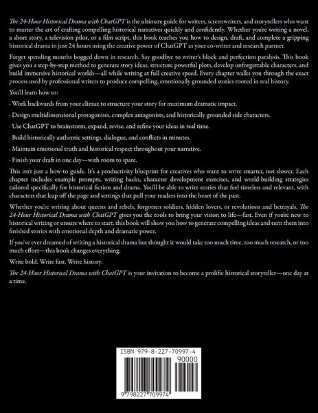 The 24-Hour Historical Drama with ChatGPT is the ultimate guide for writers, screenwriters, and storytellers who want to master the art of crafting compelling historical narratives quickly and confidently. Whether you're writing a novel, a short story, a television pilot, or a film script, this book teaches you how to design, draft, and complete a gripping historical drama in just 24 hours using the creative power of ChatGPT as your co-writer and research partner. Forget spending months bogged down in research. Say goodbye to writer's block and perfection paralysis. This book gives you a step-by-step method to generate story ideas, structure powerful plots, develop unforgettable characters, and build immersive historical worlds-all while writing at full creative speed. Every chapter walks you through the exact process used by professional writers to produce compelling, emotionally grounded stories rooted in real history. You'll learn how to: · Work backwards from your climax to structure your story for maximum dramatic impact. · Design multidimensional protagonists, complex antagonists, and historically grounded side characters. · Use ChatGPT to brainstorm, expand, revise, and refine your ideas in real time. · Build historically authentic settings, dialogue, and conflicts in minutes. · Maintain emotional truth and historical respect throughout your narrative. · Finish your draft in one day-with room to spare. This isn't just a how-to guide. It's a productivity blueprint for creatives who want to write smarter, not slower. Each chapter includes example prompts, writing hacks, character development exercises, and world-building strategies tailored specifically for historical fiction and drama. You'll be able to write stories that feel timeless and relevant, with characters that leap off the page and settings that pull your readers into the heart of the past. Whether you're writing about queens and rebels, forgotten soldiers, hidden lovers, or revolutions and betrayals, The 24-Hour Historical Drama with ChatGPT gives you the tools to bring your vision to life-fast. Even if you're new to historical writing or unsure where to start, this book will show you how to generate compelling ideas and turn them into finished stories with emotional depth and dramatic power. If you've ever dreamed of writing a historical drama but thought it would take too much time, too much research, or too much effort-this book changes everything. Write bold. Write fast. Write history. The 24-Hour Historical Drama with ChatGPT is your invitation to become a prolific historical storyteller-one day at a time.