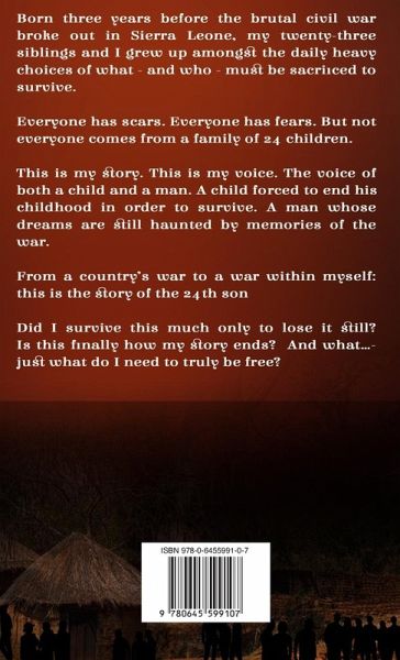 Born three years before the brutal civil war broke out in Sierra Leone, my twenty-three siblings and I grew up amongst the daily heavy choices of what - and who - must be sacrificed to survive. Everyone has scars. Everyone has fears. But not everyone comes from a family of 24 children. This is my story. This is my voice. The voice of both a child and a man. A child forced to end his childhood in order to survive. A man whose dreams are still haunted by memories of the war. From a country's war to a war within myself: this is the story of the 24th son. I have achieved my three goals-degree, wife and house-and was even lucky enough to have my beloved mother there to witness it. But will it all come undone because of the legacy of the war?