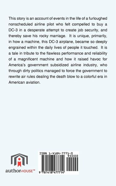 This story is an account of events in the life of a furloughed nonscheduled airline pilot who felt compelled to buy a DC-3 in a desperate attempt to create job security, and thereby save his rocky marriage. It is unique, primarily, in how a machine, this DC-3 airplane, became so deeply engrained within the daily lives of people it touched. It is a tale in tribute to the flawless performance and reliability of a magnificent machine and how it raised havoc for America's government subsidized airline industry, who through dirty politics managed to force the government to rewrite air rules dealing the death blow to a colorful era in American aviation.