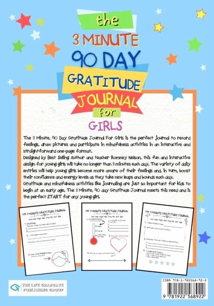 The 3 Minute, 90 Day Gratitude Journal For Girls is the perfect journal to record feelings, draw pictures and participate in mindfulness activities in an interactive and straightforward one-page format. Designed by Best Selling Author and Teacher Romney Nelson, this clear, fun and interactive design for young girls will take no longer than 3 minutes each day. The daily entries will help young girls to become more aware of their feelings and, in turn, boost their confidence and energy levels as they take new leaps and bounds each day. Gratitude and mindfulness activities like journaling are just so important for kids to begin at an early age. The 3 Minute, 90 Day Gratitude Journal For Girls is the PERFECT START for any young child. Product Description: · Ideal 7 x 10 inch format: This format helps young writers to include photos, write and draw · Interactive and Easy: An excellent variety of daily entry templates to keep girls enthusiastic about using their Gratitude Journal · 100 Pages: Lots of entries for boys to record their daily information · Gloss Cover: For extra durability · Write, Color and Draw: Writing, coloring and spaces to include drawings · Designed specifically for Young Girls: Suitable for ages 4 - 8 but is also suitable for older kids who haven't used a Gratitude Journal before. Scroll up and click the 'Buy Now' button today.