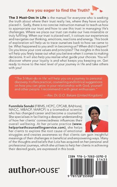 Are you eager to find the Truth? The 3 Must-Dos in Life is the manual for everyone who is seeking the truth about where their trust really lies, where they have actually placed it. Sadly, there is no concise instruction manual to teach us how to appropriate our trust and how to use this trust in managing life's challenges. Where we place our trust can make our lives miserable or truly fulfilling. When our trust is placed well, it colours our experiences and navigates our thinking, emotions, reactions and energy. This book of exploration will help us to trace ourselves back to how we came to be. What happened to you and I in becoming us? When did it happen? Do you know your core values and principles? The insights in this book will help you finely tease out what you believe when it comes to making decisions. It will also help you realise what guide your choices. You will discover where your loyalty is and what keeps you keeping on. Get ready to move to the next level of your journey in life and take others with you!