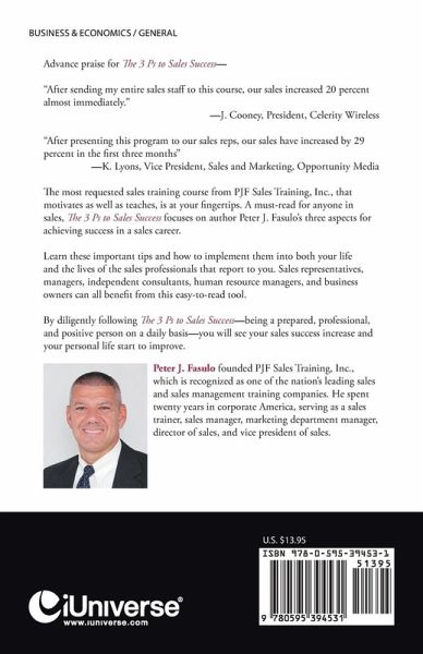 Advance praise for The 3 Ps to Sales Success- "After sending my entire sales staff to this course, our sales increased 20 percent almost immediately." -J. Cooney, President, Celerity Wireless "After presenting this program to our sales reps, our sales have increased by 29 percent in the first three months" - K. Lyons, Vice President, Sales and Marketing, Opportunity Media The most requested sales training course from PJF Training, Inc., that motivates as well as teaches, is at your fingertips. A must-read for anyone in sales, The 3 Ps to Sales Success focuses on author Peter J. Fasulo's three aspects for achieving success in a sales career. Learn these important tips and how to implement them into both your life and the lives of the sales professionals that report to you. Sales representatives, managers, independent consultants, human resource managers, and business owners can all benefit from this easy-to-read tool. By diligently following The 3 Ps to Sales Success-being a prepared, professional, and positive person on a daily basis-you will see your sales success increase and your personal life start to improve.
