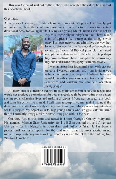 This was the email sent out to the authors who accepted the call to be a part of this devotional book: Greetings, After years of wanting to write a book and procrastinating, the Lord finally put a topic on my heart that could not have come at a better time. I want to create a devotional book for young adults. Living as a young adult Christian male is not an easy task, especially in today's culture. I have made a list of topics I feel young adults struggle with today. I believe many young adults live the way they do, or act the way they act because they honestly are not aware of powerful Biblical principles they need to apply to certain areas in their lives. Or perhaps they have not heard these principles shared in a way they can understand and apply them effectively. I want to compile a devotional book with various topics and various authors, and I am inviting you to be an author in this project. I believe there are valuable insights you can share from your own experience and wisdom that can help countless young people. Although this is something that would be voluntary if you choose to accept, and would not produce a commission for you, the result could be something even better: saving souls, changing lives and making disciples. If one person reads this book and turns his or her life around, I will have accomplished my goal. Imagine if the devotion that shifted somebody's life, came from you. Money is not my intention for this project. My objective is to help young adults who struggle with the same things I currently struggle with, or have struggled with in the past.