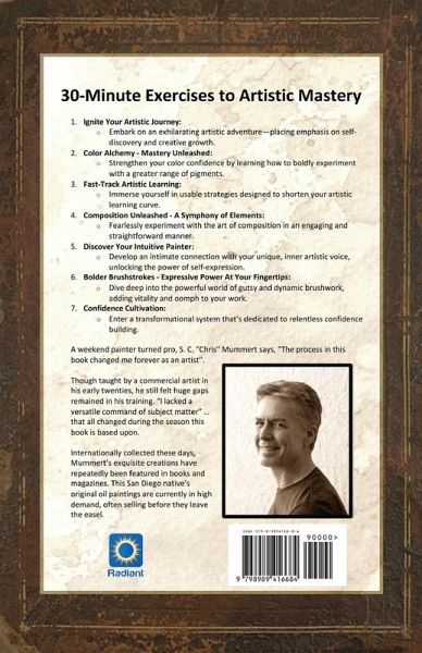 30-Minute Exercises to Artistic Mastery 1. Ignite Your Artistic Journey:Embark on an exhilarating artistic adventure-placing emphasis on self-discovery and creative growth. 2. Color Alchemy - Mastery Unleashed:Strengthen your color confidence by learning how to experiment boldly with a greater range of pigments. 3. Fast-Track Artistic Learning:Immerse yourself in usable strategies designed to shorten your artistic learning curve. 4. Composition Unleashed - A Symphony of Elements:Fearlessly experiment with the art of composition in an engaging and straightforward manner. 5. Discover Your Intuitive Painter:Develop an intimate connection with your unique, inner artistic voice, unlocking the power of self-expression. 6. Bolder Brushstrokes - Expressive Power At Your Fingertips:Dive deep into the powerful world of gutsy and dynamic brushwork, adding vitality and oomph to your work. 7. Confidence Cultivation:Enter a transformational system that's dedicated to relentless confidence building. A weekend painter turned pro, S. C. "Chris" Mummert says, "The process in this book changed me forever as an artist". Though taught by a commercial artist in his early twenties, he still felt huge gaps remained in his training. "I lacked a versatile command of subject matter" ... that all changed during the season this book is based upon. Internationally collected these days, Mummert's exquisite creations have repeatedly been featured in books and magazines. This San Diego native's Original oil paintings are currently in high demand, often selling before they leave the easel.
