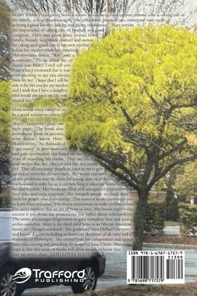 MARY BANKS' caregiving book is meant to encourage and support anyone who is taking care of the elderly, sick or disadvantaged. She talks about physical care, emotional care; such as being a good listener, talking and giving reassurance. Mary stresses the importance of taking care of yourself as a good caregiver. Mary was given many praises from family, friends, neighbors, doctors and nurses for taking such good care of her own mother before her mother made her transition. Her mother's driver, "Ray" sent a statement: "Please allow me to thank you Mary! I will tell you from what I witnessed that it was very pleasing to see you always there for her. I hope that I will be able to be like you for my mother and I wish that I have a daughter who would also treat me like you treated her." Mary wants every caregiver to be a good witness to others. Mary inspires you on each page. The book also introduces Jesus to anyone who doesn't know Him. Mary's series, "An Attitude of Expectancy" is part-memoirs and part-testimonial tips based on her years of recording life events. They are filled with stories that her relatives told her as a young girl. They all encourage people to learn to never give up and to strive for the very best. She writes that some of our problems may be there for a long time in order to teach us and in order for us to see how long it takes our hearts to become humble. Her books are filled with unexpected experiences, love, pain and even rejection. She compels people to check their circle for people who drain energy. This series of books encourages you to learn from mistakes. She shares testimonies in order to bless others. Her series explains that we are all born to love. Her books explain that success is not about our possessions; but rather about relationships. The series encourages forgiveness to gain complete love and peace within ourselves. Mary is the third child born to an African American family on Chicago's southside. She graduated from DePaul University and has six degrees including an honorary doctorate of divinity and a doctorate of Philosophy. She retired from law enforcement and spends time volunteering and preaching the gospel of Jesus Christ. Her hope is that this series of books will allow people to know that they are never alone. GOD LOVES YOU!!!