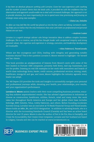 The CEO and the leadership team are on the job at all times, expected to be available on a moment's notice. The term, 24/7, is a reality to most of us and has blurred the separation between our personal and work lives. This book provides an amalgamation of lessons from Moore's work with some of the best leaders in Fortune 1000 companies, privately held firms, mid-cap businesses, and not-for-profit organizations. Drawing on real-life examples from energy/oil and gas, financial services, professional services, world-class technology firms, mining, retail, healthcare, and more, Moore highlights the industry agnostic practices of both individual leaders and teams. The 360 Degree CEO provides the tools and insights to successfully navigate our personal and professional journeys, elevating our health, our relationships, our results, and our organization's performance.