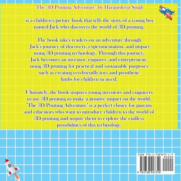 "The 3D Printing Adventure" is an exciting children's book that takes young readers on a journey of creativity and innovation. Through colorful illustrations and engaging storytelling, the book introduces the concept of 3D printing in a fun and accessible way. The story follows a young boy named Jack who has a passion for drawing spaceships. He dreams of bringing his drawings to life and his wish comes true when he discovers a magical 3D printer that can turn his drawings into real objects. With the help of his friends, Jack explores the possibilities of 3D printing and creates all sorts of amazing objects, from toy cars to castles to a mouth-watering plastic cake. This book is not only a fun adventure, but it also serves as an educational tool to introduce children to the world of 3D printing. It encourages creativity, problem-solving, and teamwork, as the characters work together to bring their ideas to life. The book also touches on the importance of technology and its potential to make a positive impact on the world. Parents and educators will appreciate the book's ability to engage children in a hands-on, imaginative learning experience. The book is perfect for children ages 5-12, but can be enjoyed by readers of all ages. It is an excellent addition to any classroom or home library, and a great way to spark children's interest in science, technology, engineering, and math (STEM) fields. Overall, "The 3D Printing Adventure" is a must-read for any young adventurer or curious mind who wants to learn about the possibilities of 3D printing and the power of imagination.