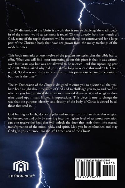 The 3rd dimension of the Christ is a work that is sure to challenge the traditionalist of the church world as we know it today! Written directly from the mouth of God, many of the topics discussed will be considered too controversial for a large part of the Christian body that have not grown from the milky teachings of the modern times. This book unmasks at least twelve of the greatest mysteries that the bible has to offer. What you will find most interesting about this piece is that it was written over four years ago but was not allowed to be released until this upcoming year of 2008. When asked why did you take so long to release this work? Dr. Davis stated, "God was not ready to be revealed in his purest essence unto the nations, but now is the time." The 3rd Dimension of the Christ is designed to cause you to question all that you have been taught about the word of God and to challenge you to go and confirm whether you have attained the truth or a watered down version of religious doctrine based upon mans limited interpretations. This piece is sure to change the way that the purpose, identity, and destiny of the body of Christ is viewed by all those that read it. God has higher levels, deeper depths and stranger truths than those that religion has focused on and only by entering into the highest level of scriptural revelation can one receive the keys that will unlock the door that leads them into eternal transformation of the mind, body, and spirit. May you be confounded and may God give you entrance into the 3rd Dimension of the Christ!