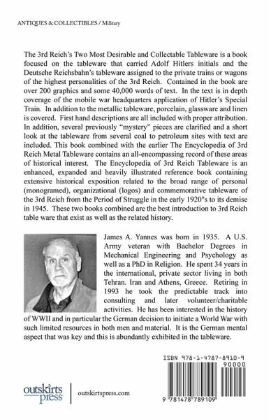 Dedicated to "The Greatest Generation" this book commemorates their victory in WWII. These collectibles of a defeated government, in large part, returned with our victorious soldiers. They offer the opportunity of holding in your hand, history. It is the only book you will need regarding the collecting and the historical context of the most desirable, collectibles of the 3rd Reich. The 3rd Reich¿s Two Most Desirable and Collectable Tableware is a book focused on the tableware that carried Adolf Hitlers initials and the Deutsche Reichsbahn¿s tableware assigned to the private trains or wagons of the highest personalities of the 3rd Reich. Contained in the book are over 200 graphics and some 40,000 words of text. In the text is in depth coverage of the mobile war headquarters application of Hitler¿s Special Train. In addition to the metallic tableware, porcelain, glassware and linen is covered. First hand descriptions are all included with proper attribution. In addition, several previously ¿mystery" pieces are clarified and a short look at the tableware from several coal to petroleum sites with text are included. This book combined with the earlier The Encyclopedia of 3rd Reich Tableware contains an all-encompassing record of these areas of historical interest. The Encyclopedia of 3rd Reich Metal Tableware is an enhanced, expanded and heavily illustrated reference book containing extensive historical exposition related to the broad range of personal (monogramed), organizational (logos) and commemorative tableware of the 3rd Reich from the Period of Struggle in the early 1920¿s to its demise in 1945. These two books combined are the best introduction to 3rd Reich table ware that exist as well as the related history..