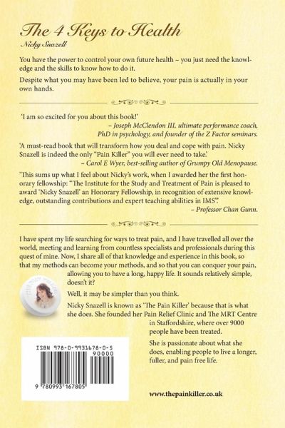 This book is a self help manual of preventative health. It has four chapters mind,food,fitness and lifestyle,with questionnaires that scores you red, amber and green.Holding 4 green keys means you are in optimum health.This book is a result of 30 years study in biology, psychology, physiotherapy and pain .It is my personal insight into health shared with my patients and audiences internationally.