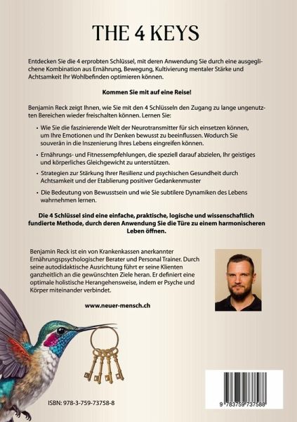 Ich zeige Ihnen, wie Sie Ihr Wohlbefinden optimieren - durch eine ausgeglichene Kombination aus Ernährung, Bewegung, Kultivierung mentaler Stärke und Achtsamkeit. Dafür bringe ich vier erprobte Schlüssel in Ihr Leben, die Sie ganz einfach anwenden können. Kommen Sie mit auf eine Reise, die Ihr Leben verändern wird! Benjamin Reck zeigt Ihnen, wie Sie mit den 4 Schlüsseln den Zugang zu lange ungenutzten Bereichen wieder freischalten - garantiert! Ich zeige Ihnen, wie Sie: die faszinierende Welt der Neurotransmitter für sich nutzen, um Ihre Emotionen und Ihr Denken bewusst zu beeinflussen. Sie lernen, wie Sie selbstbewusst und souverän in die Inszenierung Ihres Lebens eingreifen. Ernährungs- und Fitnessempfehlungen, die Ihr geistiges und körperliches Gleichgewicht unterstützen. Sie lernen, wie Sie Ihre Resilienz und psychische Gesundheit durch Achtsamkeit und positive Gedankenmuster stärken. Sie erfahren, wie Sie subtile Lebensdynamiken wahrnehmen und nutzen können. Die 4 Schlüssel sind eine einfache, praktische, logische und wissenschaftlich fundierte Methode, durch deren Anwendung Sie die Tür zu einem harmonischeren Leben öffnen. Stellen Sie sich vor, wie Sie Ihr Leben grundlegend verändern - hin zu mehr Energie, innerem Frieden und Selbstbewusstsein. Mit meinem Buch zeige ich Ihnen den Weg zu einem ganzheitlichen Wohlbefinden, das auf vier Schlüsselelementen basiert: Ernährung, Sport, Psychologie und Bewusstsein. Diese Kombination ist der Schlüssel zu einem erfüllteren, glücklicheren und gesünderen Leben - und Sie haben ihn bereits in der Hand!