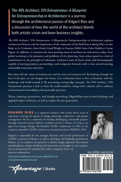 The 49% Architect, 51% Entrepreneur: A Blueprint for Entrepreneurship in Architecture is a journey through the architectural passion of Edgard Rios and a discussion of how the world of the architect blends both artistic vision and keen business insights. The 49% Architect, 51% Entrepreneur: A Blueprint for Entrepreneurship in Architecture explores architectural history and the inspirations of the visionaries of the field from Ludwig Mies ven der Rohe to Le Corbusier, from Frank Lloyd Wright to Gustave Eiffel, from Zaha Hadid to Carme Pigem. In addition, it examines the most pressing issues of architecture and society today, from global warming to the pressures and problems of city planning, from urban sprawl to a lack of commitment to the principles of urbanism. Architects must be both artists-and businesspeople capable of steering projects, partnerships, and companies forward, with a view toward creating sustainable structures and cities. But what will the vision of architecture and the cities of tomorrow be? By looking through the lens of the past, we can imagine the future. Can civilization learn to live in harmony with the landscape and world around it? By presenting cutting-edge concepts, The 49% Architect, 51% Entrepreneur presents a look at what the world could be, along with a clarion call to embrace environmental stewardship and sustainable practices. Warm, inspiring, provocative, and thought-provoking, Edgard Rios aims to both challenge and applaud today's architects, as well as inspire the next generation.