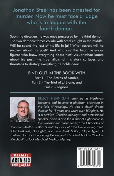 Jonathan Steel has been arrested for murder. Now he must face a judge who is in league with the fourth demon. Soon, he discovers he was once possessed by the third demon! The two demonic forces collide with Steel caught in the middle. Will he spend the rest of his life in jail? What secrets will he recover about his past? And who are the two mysterious figures who know everything about him? As Jonathan learns about his past, the true villain of his story surfaces and threatens to destroy everything he holds dear! Find out in the book with Part 1 - The Scales of Anubis, Part 2 - The Trial of JJ Stone, and Part 3 - Legions.