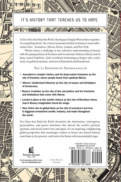 In Five Cities that Ruled the World, theologian Douglas Wilson fuses together, in compelling detail, the critical moments birthed in history's most influential cities --Jerusalem, Athens, Rome, London, and New York. Wilson issues a challenge to our collective understanding of history with the juxtapositions of freedom and its intrinsic failures; liberty and its deep-seated liabilities. Each revelation beckoning us deeper into a city's story, its political systems, and how it flourished and floundered. You'll discover the significance of: Jerusalem's complex history and its deep-rooted character as the city of freedom, where people found their spiritual liberty. Athens' intellectual influence as the city of reason and birthplace of democracy. Rome's evolution as the city of law and justice and the freedoms and limitations that come with liberty. London's place in the world's history as the city of literature where man's literary imagination found its wings. New York's rise to global fame as the city of commerce and how it triggered unmatched wealth, industry, and trade throughout the world. Five Cities that Ruled the World chronicles the destruction, redemption, personalities, and power structures that altered the world's political, spiritual, and moral center time and again. It's an inspiring, enlightening global perspective that encourages readers to honor our shared history, contribute to the present, and look to the future with unmistakable hope.